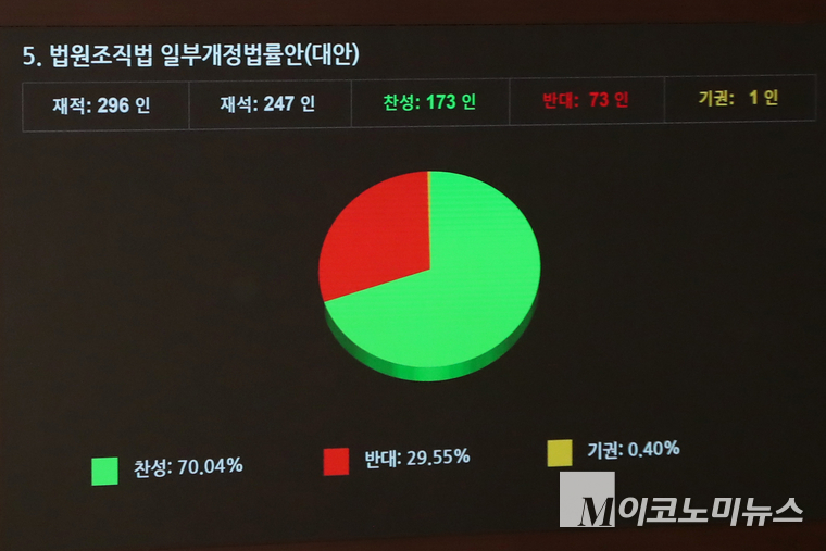 국회는 28일 오후 대법관 수를 현행 14명에서 26명으로 늘리는 법원조직법 일부개정법률안을 통과시켰다. 현재 14명인 대법관을 3년 동안 매년 4명씩 늘려 총 26명으로 증원한다는 내용의 법원조직법 개정안을 재석 의원 247명 중 찬성 173명, 반대 73명, 기권 1명으로 가결됐다.