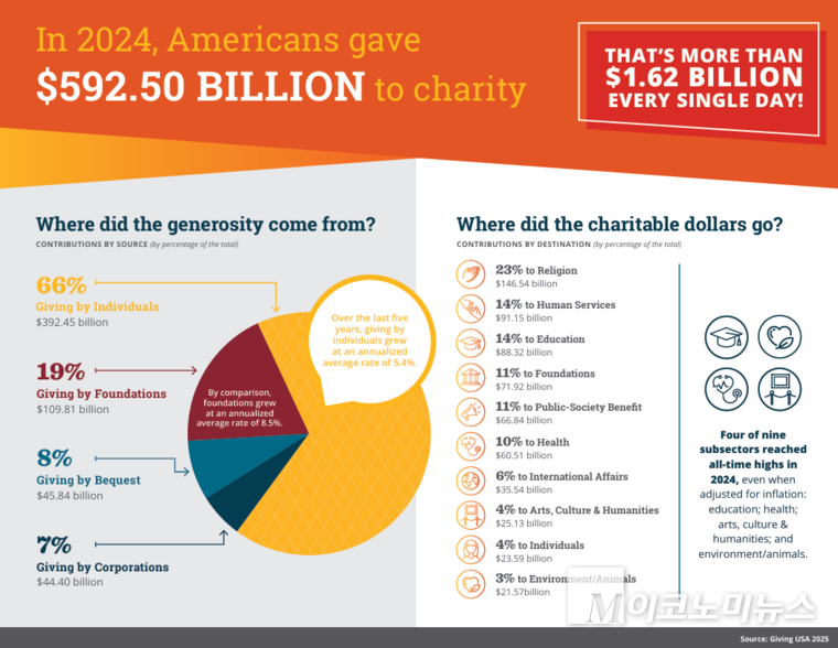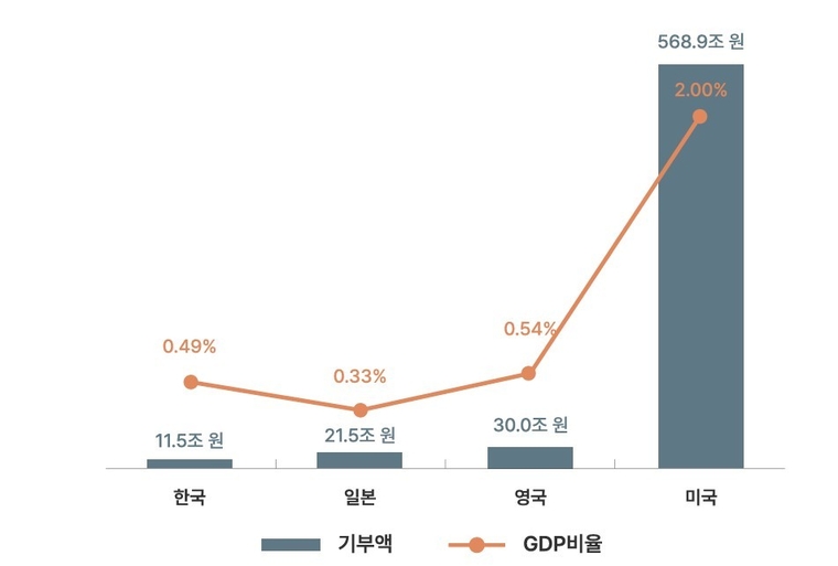 그렇다면 민간이 자발적으로 교육을 지원하는 기부금은 기대할 수 있을까? 위의 그림은 2024년 기준(우리나라는 2023년)으로 각국의 개인 기부금 규모와 기부금의 GDP 비율을 나타내고 있다. 미국은 개인 기부액이 568조9000 억원으로 GDP의 2.0%를 차지하고 있는 반면, 우리나라는 11조5000억원으로 GDP의 0.49%에 불과하다. 세계기 부지수(World Giving Index 2024)에서 8위를 차지한 미국 과 88위를 차지한 우리나라의 현주소이기도 하다.