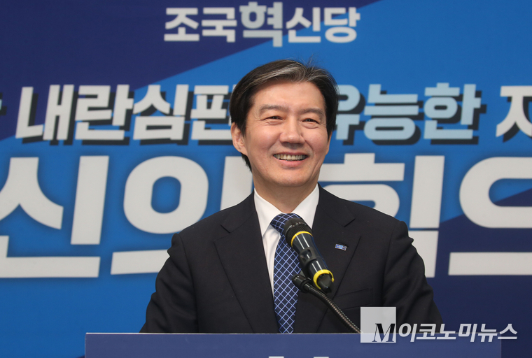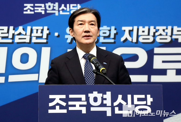 「M포토」 창당 2주년 기자간담회에서 발언하는 조국