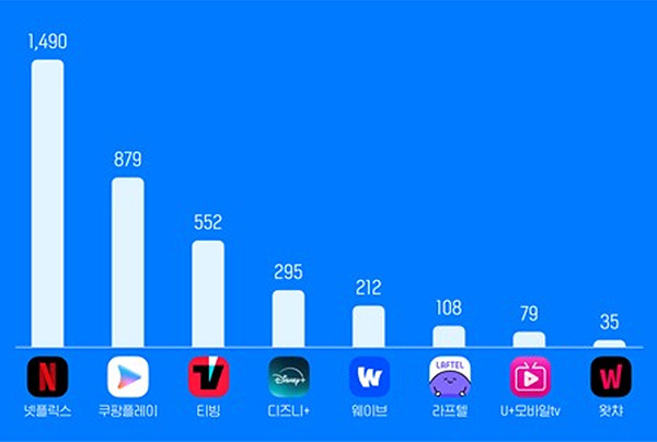 한국인이 가장 많이 사용하는 OTT(Over The Top, 인터넷 콘텐츠 제공 서비스)는 넷플릭스가 독보적인 1위를 지키고 있다. 언론에 따르면 디즈니+는 지난달 신규 설치가 66만건으로 OTT 전체 중 1위를 기록했다. 이는 넷플릭스(51만), 쿠팡플레이(53만), 티빙(50만)보다 높은 수치다. 디즈니+의 MAU(월간 이용자 수)는 1월 317만에서 지난달 407만으로 약 30%가 증가했다.