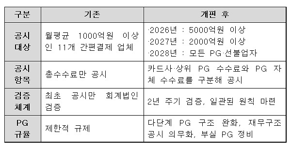 두 번째는 ‘PG업 규율 강화’다. 금융위는 다단계 PG 구조 개선을 통해 카드사·상위 PG·하위 PG 간 수수료 흐름을 구분해 공시하도록 했다. 이는 회계법인의 검증을 거쳐 신뢰성을 확보하기 위한 조치다. 과거 티몬·위메프 사태와 같은 정산 부실 문제를 예방하가 위한 목적이다.