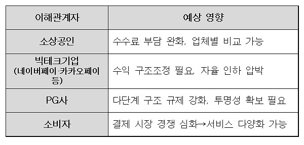 또 삼성페이·LG페이 등 제조사 측에서는 수수료 인하 압력은 적은 대신 PG사와의 협력 구조에 영향을 미칠 것으로 예상된다. NHN페이코·KG이니시스 등 PG사들은 다단계 PG 구조 규제 강화로 재무건전성에 차질을 우려하며 사업 지속성을 위협받을 수 있다는 불안이 있는 것으로 파악됐다.