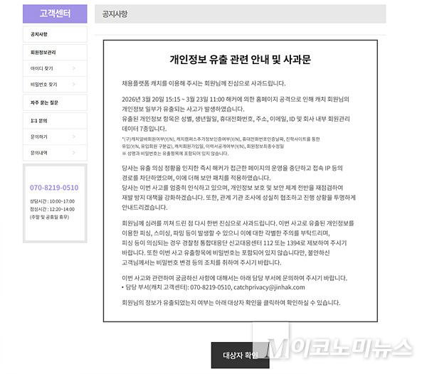 캐치 관계자는 “회원님들께 심려를 끼쳐드린 점 진심으로 사과드린다”며 “이번 사고를 엄중히 인식하고 있으며, 향후 보안 강화와 개인정보 보호를 최우선 과제로 삼겠다”고 강조했다.