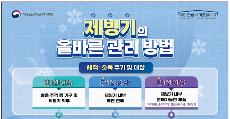 식약처는 현장 점검과 함께 영업자 등을 대상으로 ‘제빙기의 올바른 관리 방법’ 안내문을 배부하고, 주기적인 세척과 소독 등 제빙기 청결 관리 강화를 당부했다. 또 소비자가 안심하고 제빙기 얼음을 섭취할 수 있도록 누리집에 ‘제빙기 위생관리 안내서’를 공개하고 있다고 밝혔다.