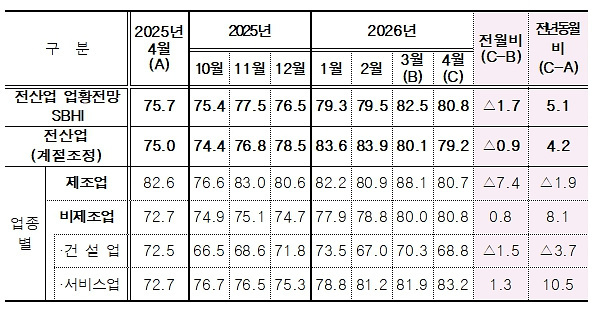 제조업의 내달 경기전망은 80.7로 전월 대비 7.4p 급락했다. 특히 고무·플라스틱제품(-17.2p), 섬유제품(-16.3p), 인쇄·기록매체 복제업(-16.3p) 등 전통 제조업종의 하락 폭이 두드러졌다. 반면 음료(91.9, 4.7p 상승), 전자부품·컴퓨터·통신장비(94.8, 4.3p 상승) 등 일부 첨단·소비재 업종은 상승세를 보였다.