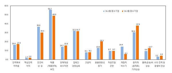 이달에 국내 주요 중소기업들이 가장 크게 지적한 애로는 매출 부진(49.0%)이었다. 이어 △원자재 가격 상승(37.9%) △업체 간 경쟁 심화(31.7%) △인건비 상승(30.3%)이 주요 부담으로 꼽혔다. 이는 경기 둔화와 비용 압박이 동시에 중소기업을 압박하는 구조적 문제를 보여준다.