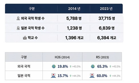 자료를 보면, 외국 국적 학생은 2014 년 5788명에서 2023년 3만7715명 으로 약 6배 이상 증가했으며, 일본 국적 학생 역시 1238명에서 6839명으로 크게 늘어났다. 특히 이러한 학생들을 지원하기 위한 학교 수가 같은 기간 1396개교에서 6394개교로 증가했다는 점은 중요한 의미를 가진다. 이는 단순히 학생 수가 늘어난 것에 대응하는 수준을 넘어, 교육 시스템 자체가 언어 다양성에 대응하는 방향으로 재구성되고 있음을 보여주는 지표라고 할 수 있다.