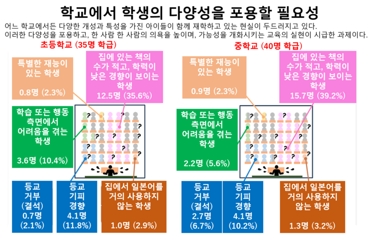 문부과학성 자료 가운데 특히 주목할 만한 것은, 오늘날 한 학급이 어떤 학생들로 구성되어 있는지를 구체적인 수치로 보여주는 대목이다. 이 자료는 초등학교 35명, 중학교 40명이라는 실제 학급 규모를 기준으로, 교실 안에 이미 얼마나 다양한 배경과 조건의 학생들이 함께 존재하고 있는지를 시각적으로 제시한다. 추상적으로 ‘학생의 다양성이 커지고 있다’고 말하는 데 그치지 않고, 그 다양성이 실제로 한 교실 안에서 어느 정도의 비중을 차지하는지를 눈에 보이게 만든다는 점에서 의미가 크다.