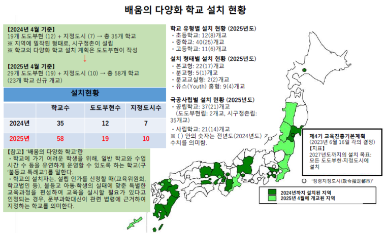 이러한 흐름은 제도적 차원에서도 분명하게 나타난다. 문부과학성이 제시한 ‘배움의 다양화 학교’의 확대는, 변화된 문제 인식이 실제 교육 시스템 설계 로 이어지고 있음을 보여주는 대표적인 사례다.