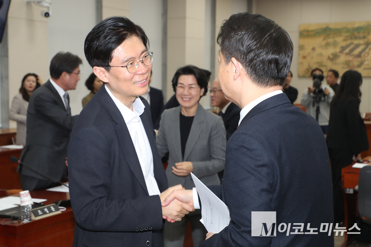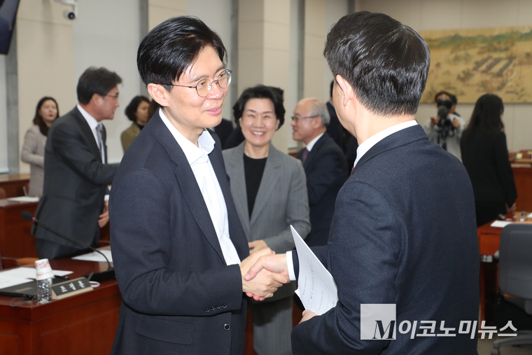 「M포토」 추경안 의결 뒤 악수하는 김영호-조정훈