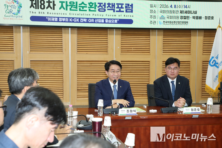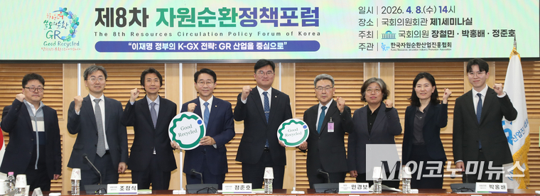 더불어민주당 장철민·박홍배·정준호 의원 주최로 ‘제8차 자원순환정책포럼’이 8일 국회에서 개최됐다. 이번 포럼은 ‘이재명 정부의 K-GX 전략’을 주제로 GR(우수재활용제품) 인증제도 현황을 진단하고 산업의 미래 발전 방향을 모색하기 위해 마련됐다.
