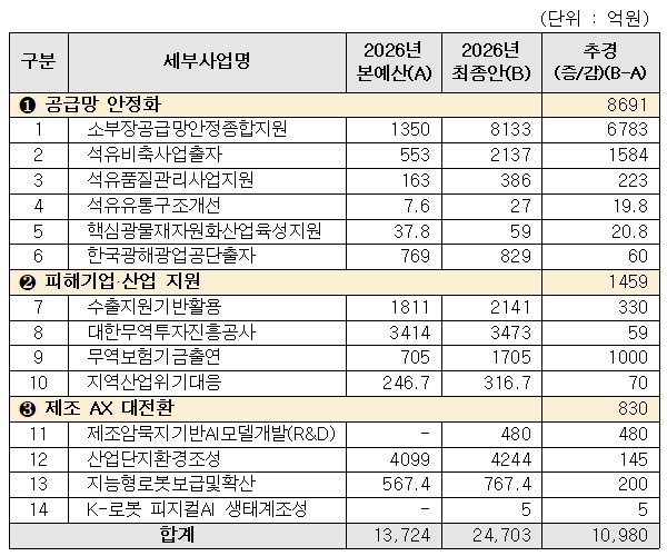 산업통상부의 올해 첫번째 추가경정예산이 10일 국회 본회의 의결을 거쳐 1조980억원 규모로 최종 확정됐다. 이번 추경은 중동전쟁 위기 극복을 위해 석유·핵심 전략자원의 공급망 안정화 8691억원, 수출기업 비용 경감 및 석유화학 등 피해산업 지원 1459억원, 제조 AX 대전환을 위한 830억원 등 총 1조940억원으로 구성됐다.