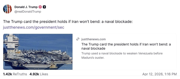 트럼프 대통령은 12일(현지시간) 협상 결렬 수시간 뒤 SNS 트루스소셜에 ‘이란이 굽히지 않을 경우 대통령이 쥔 카드는 해상 봉쇄’라는 취지의 기사를 올렸다. 해당 글은 이란이 미국의 제안을 수용하지 않을 경우, 미국이 과거 베네수엘라에 취했던 방식처럼 이란의 원유 수출을 차단하고, 이란산 원유를 수입하는 중국과 인도에도 외교적 압박을 가할 수 있다고 주장했다. 이 게시물은 트럼프 대통령이 협상 결렬 직후 별도의 직접 입장 표명 없이 대이란 압박 수단을 우회적으로 부각한 것으로 해석된다.