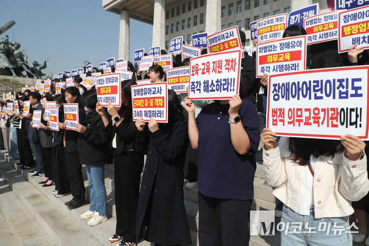 참석자들은 “차별없는 장애유아 의무교육 즉각 시행”, “장애 영유아 교사 근무 여건, 유보 격차 조속히 해결”, “교육부 장애 영유아 전담 부서 설치”, “교사 대 장애 영유아 비율 1대 2로 조정” 등의 문구가 적힌 피켓을 들고 구호를 외쳤다.
