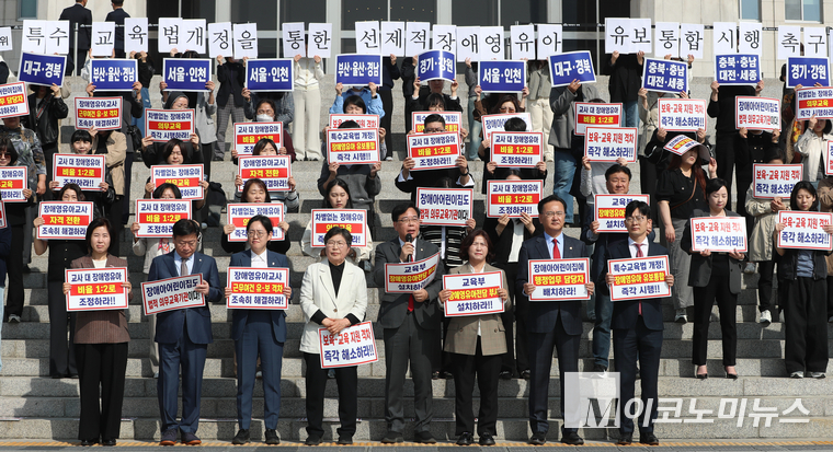 국민의힘 약자와의동행위원회는 15일 국회 본관 앞 계단에서 ‘특수교육법 개정을 통한 선제적 장애 영유아 유보통합 시행 촉구 대회’를 열고 특수교육 교사-아동 비율, 교사 처우 등 개선 등을 촉구했다.