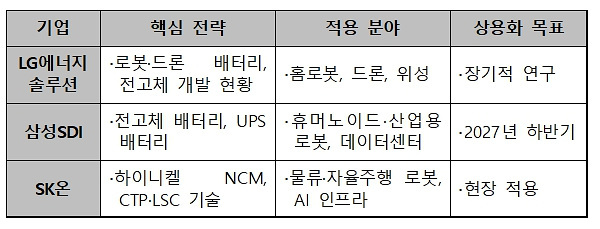 국내 대표 배터리 기업인 LG에너지솔루션·삼성SDI·SK온 등 3개사는 최근 전고체·로봇·자율주행 전략을 공개했다. 이들 3개 기업은 전기차 중심에서 로봇·AI·데이터센터까지 사업 영역을 확장하는 청사진을 제시했다. 미래 혁신 사업의 핵심은 전고체 배터리 상용화, 로봇용 배터리, 자율주행·물류 로봇 적용 확대에 있다.