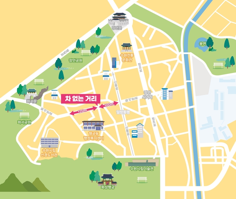 수원특례시(시장 이재준)는 "수원시 행궁동 화서문로 34번지부터 신풍로 47번지까지 220여 m 구간에 대해 오는 5월부터 매주 토요일 ‘차 없는 거리’로 운영해 나갈 것"이라고 28일 밝혔다.