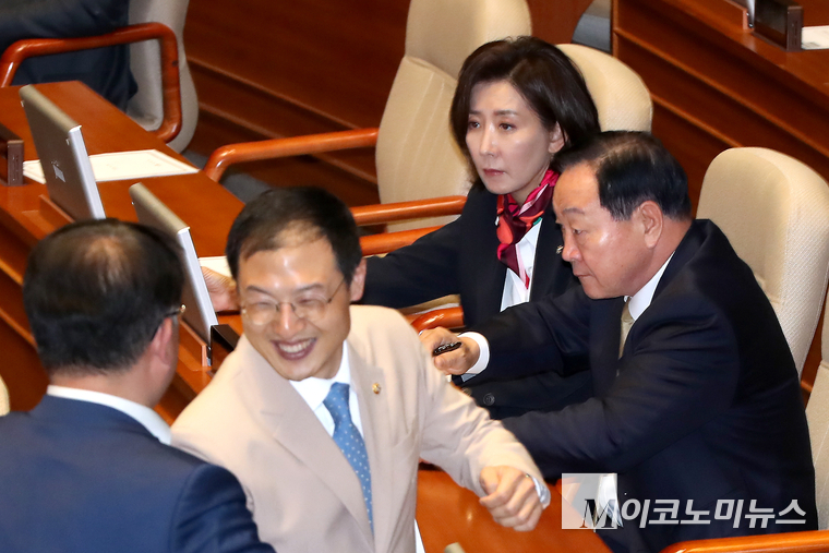 「M포토」 국민의힘 인사 간 김상욱 말리는 김민규