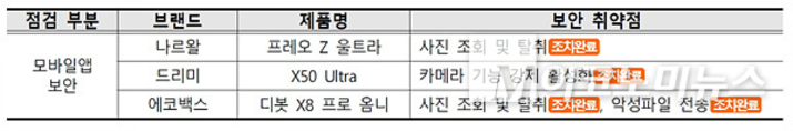 한국인터넷진흥원(KISA)은 한국소비자원과 함께 시중에 유통 중인 로봇청소기 6개 제품의 보안 실태를 조사한 결과, 일부 제품에 사생활 침해와 개인정보 유출 가능성이 있는 보안 취약점이 확인돼 즉시 조치했다고 밝혔다. 로봇청소기는 카메라와 센서를 통해 외부 서버와 통신하는 사물 인터넷(IoT) 제품이다. 편의성과 효율성으로 최근 사용자가 증가하고 있으나, 보안성이 미흡할 경우 개인정보 등이 유출될 수 있어 각별한 주의가 필요하다. 이번에 조사대상은 △나르왈 ‘프레오 Z 울트라’(모델명 YJCC017) △드리미 ‘X50 Ultra’(모델명 RLX85CE) △로보락의 ‘S9 MaxV Ultra’(모델명 S90VER) △삼성전자의 ‘BESPOKE AI 스팀’(모델명 VR7MD97716G) △에코백스의 ‘디봇 X8 프로 옴니’(모델명 DEX56) △LG전자의 ‘코드제로 로보킹 AI 올인원’(모델명 B95AWBH) 등 6개 제품이다. KISA와 한국소비자원은 조사대상 6개 제품에 대해 로봇청소기를 제어·설정하는 ‘모바일앱 보안’, 제조사의 보안 업데이트 정책·개인정보 보호정책 등을 포함한 ‘정책 관리’, 하드웨어·네트워크·펌웨어(내장 소프트웨어) 등 ‘기기 보안’ 분