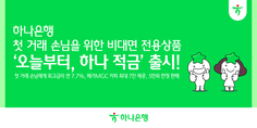 하나은행은 처음 거래하는 손님을 대상으로 최고 연 7.7%의 금리를 제공하는 비대면 전용 적금 상품인 ‘오늘부터, 하나 적금’을 출시했다고 지난 5일 밝혔다. 올해 말까지 5만좌 한도로 판매되며, 가입금액은 매월 1만원 이상 20만원 이하이다. 적용금리는 기본금리 연 2.0%에 우대금리 최대 연 5.7%를 더해 최고 연 7.7%이며 계약기간은 6개월이다. 우대금리 조건은 ▲적금 가입 전일 기준 직전 6개월 동안 하나은행 상품을 보유하지 않은 경우 연 4.7% ▲하나은행 입출금통장에서 이 적금으로 3회 이상 자동이체 시 연 0.5% ▲적금 가입 전 하나은행 상품, 서비스 마케팅 등 선택 동의 항목을 모두 동의한 경우 연 0.5%이다. 지난 9월 4일부터 10월 19일까지 가입 이벤트를 진행중이며 적금 가입 손님 중 첫 거래 손님 대상 전원에게 메가MGC커피 최대 7잔(기본 2잔, 청약종합저축 가입 시 최대 3,000명 5잔 추가)을 제공하고 있다. 또한 주택청약저축 가입, 급여이체 등 추가 교차거래 시 추첨을 통해 백화점 상품권의 혜택이 제공되며 하나은행 대표 스마트폰 어플인 하나원큐를 통해 상품가입 및 이벤트 응모가 가능하다. 하나은행 관계자는 “하나은행과