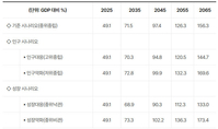 국내총생산(GDP) 대비 50% 수준인 국가채무비율이 40년 이후에는 150%대(3배)로 급등할 것이라는 전망이 나왔다. 이는 인구가 감소하고, 경제 성장세가 둔화하는 현재의 흐름을 반영한 전망치라 더 암울하다. 기획재정부는 3일 이런 내용을 담은 '제3차 장기재정전망'(2025~2065)을 발표했다. 장기재정전망은 미래 재정 위험을 점검하고, 중장기 재정건전성을 관리하기 위한 것으로 국가재정법에 규정돼있다. 특히 2065년 GDP 대비 국가채무비율은 156.3%로 추계됐다. 국가채무비율은 인구 시나리오별로 144.7~169.6% 범위에서, 성장 시나리오별로는 133.0~173.4% 범위에서 변동할 것으로 예상됐다. 중간값에 해당하는 기준 시나리오 결과(156.3%)는 한국개발연구원(KDI·2060년 144.8%), 국회 예산정책처(2072년 173.0%) 등의 전망과 엇비슷한 수준이다. 올해 국가채무비율(49.1%)과 비교하면 40년간 3배로 높아진다는 의미다. 국가채무비율은 2035년 71.5%로 70%선을 넘어서면서 2045년 97.4%, 2055년 126.3%로 가파른 우상향 곡선을 그릴 것으로 전망됐다. 기재부는 "향후 40년간 현행 제도와 정책이