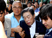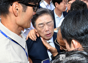 김형석 독립기념관장이 8일 국회 소통관에서 기자회견을 열었다가 항의하는 시민들과 마주치면서 경내를 빠져나가지 못하고 대치하는 소동이 벌어졌다.