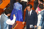 제429회국회(정기회) 개회식이 1일 국회 본청 본회의장에서 열렸다. 더불어민주당을 비롯한 범여권 의원들은 이날 통합의 차원에서 한복을 입고 참석해 기념사진을 찍은 모습이 눈길을 끌었다.