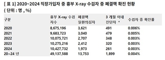 더불어민주당 김윤 의원(국회 보건복지위원회, 비례대표)이 국민건강보험공단으로부터 제출받은 자료를 분석한 결과, 2020년부터 2024년까지 직장가입자의 흉부 X-ray 수검자 중 3개월 이내 폐결핵 진단률은 평균 0.004%에 불과한 것으로 나타났다. 이는 같은 기간 발생한 신규 결핵환자 88,116명 중 단 2.1% 만이 근로자 건강진단을 통해 발견된 수준으로, 근로자 건강권 보호를 위해 시행 중인 흉부 X-ray 검사가 결핵 조기발견 기능은 물론 근로자 보호 목적도 달성하지 못하고 있는 것으로 드러났다. 현행 「산업안전보건법」은 사업주가 상시 근로자에 대해 건강진단을 의무적으로 실시하도록 하고 있으며, 그 항목에 흉부방사선검사(X-ray)가 포함되어 있다. 사업주가 국가 일반건강검진 결과로 이를 대체할 수 있도록 규정돼 있어, 실제 현장에서는 근로자 건강진단이 사실상 국가건강검진으로 대체된 형태로 운영되고 있다. 2020년부터 2024년까지 직장가입자의 흉부 X-ray 수검자 중 폐결핵 진단 현황을 분석한 결과 2020년 0.006%에서 2024년 0.003%로 절반 수준으로 감소했고, 5년간 평균 진단률은 0.004%에 그쳤다. 한편, 2019년 ~20